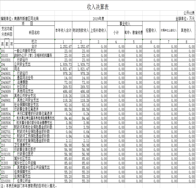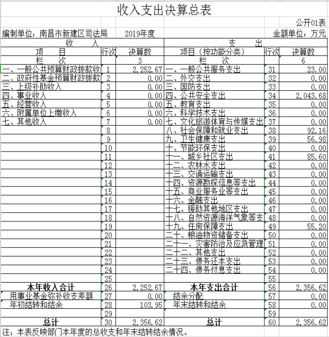 本部門2019年度收入總計2356.62萬元,其中年初結轉和結余103.95萬元,較2018年增加了390.09 萬元,增長了19.84 %;本年收入合計 2252.67萬元,較2018年增加了506.79 萬元,增長了29.03 %,主要原因是:本年度增加了普法宣傳工作經費及36名社區矯正輔助人員工資。