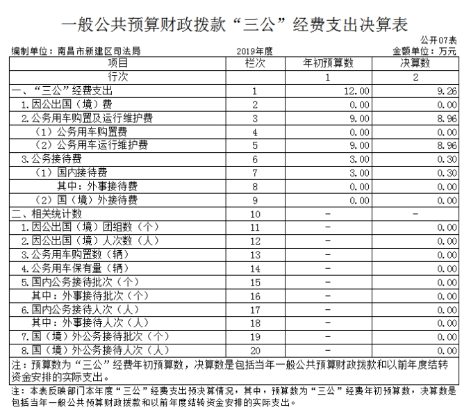 (二)公務用車購置及運行維護費支出 8.96萬元,其中公務用車購置年初預算數為0 萬元,決算數為0萬元,完成預算的0%;決算數較2018年增長0萬元。公務用車運行維護費支出年初預算數為9萬元,決算數為8.96萬元,完成預算的99 %,決算數較2018年增長3.3萬元,主要原因是增加了社區矯正走訪用車及普法宣傳用車費用。
