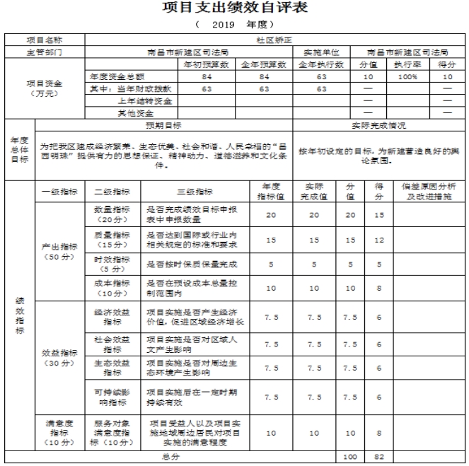 我單位對社區矯正項目開展了項目績效評價,涉及一般公共預算支出 84 萬元。從評價情況來看,項目嚴格按預算執行,社區矯正項目年初預算為84萬,截止2019年12月31日區財政下撥社區矯正經費63萬元,實際支出63萬元。其中社區矯正輔助人員工資54.96萬元,社區矯正走訪費用8.04萬元。