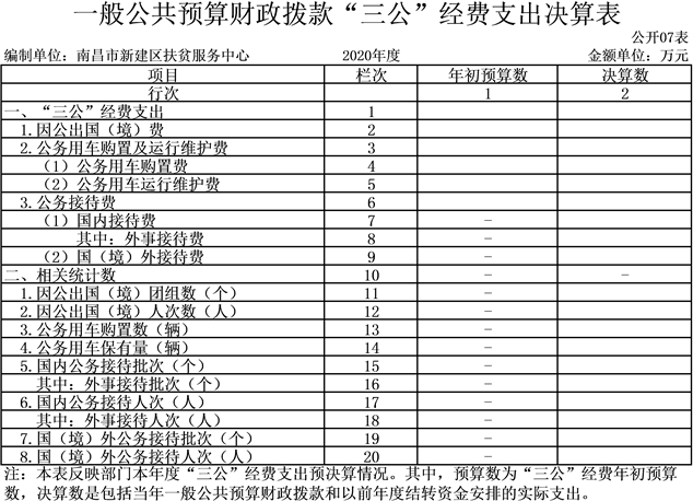 (六)“三公”經費:納入財政預算管理的“三公”經費,是指用一般公共預算撥款安排的公務接待費、公務用車購置及運行維護費和因公出國(境)費。其中,公務接待費反映單位按規定開支的各類接待支出;公務用車購置及運行費反映單位公務用車車輛購置支出(含車輛購置稅),以及燃料費、維修費、保險費等支出;因公出國(境)費反映單位公務出國(境)的國際旅游費、國外城市間交通費、食宿費等支出。
