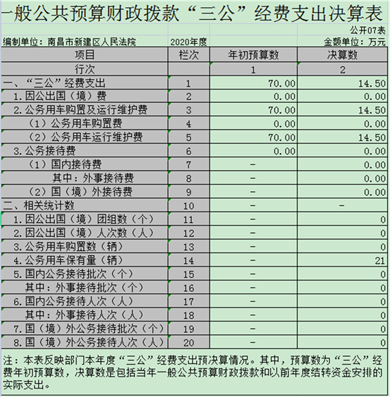 (三)公務用車購置及運行維護費支出70萬元,其中公務用車購置年初預算數為 0萬元,決算數為0萬元,完成預算的0%,決算數較2019年增加0萬元,增長0 %,主要原因是無此類支出,全年購置公務用車0輛。決算數較年初預算數增加主要原因是:無此類支出;公務用車運行維護費支出年初預算數為70 萬元,決算數為14.5萬元,完成預算的20.71%,決算數較2019年減少3.96萬元,下降21.45%,主要原因是節能減排,綠色出行,積極響應過緊日子的號召,節約開支,年末公務用車保有21輛。決算數較年初預算數增加(減少)的主要原因是:能減排,綠色出行,積極響應過緊日子的號召,節約開支。