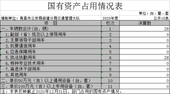 截止2020年12月31日,本部門(單位)國有資產占用情況見公開10表《國有資產占用情況表》。其中車輛中的其他用車28輛,主要是特種技術車輛。