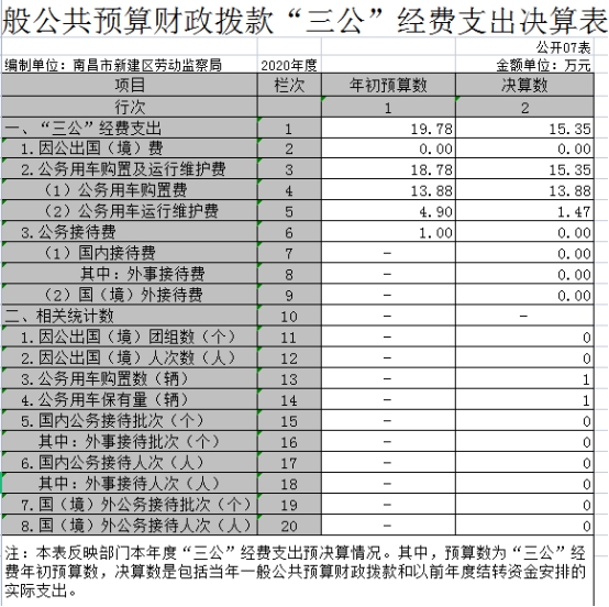(三)公務用車購置及運行維護費支出15.35萬元,其中公務用車購置年初預算數為13.88萬元,決算數為13.88萬元,完成預算的100%,決算數較2019年增加13.88萬元,增長100%,主要原因是2019年未發生公務用車購置支出,全年購置公務用車1輛。公務用車運行維護費支出年初預算數為4.90萬元,決算數為1.47萬元,完成預算的30%,決算數較2019年減少0.01萬元,下降0.68%,主要原因是公務用車運行維護費支出減少,年末公務用車保有1輛。決算數較年初預算數減少的主要原因是:公務用車運行維護費支出減少。