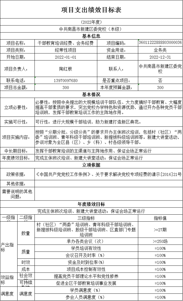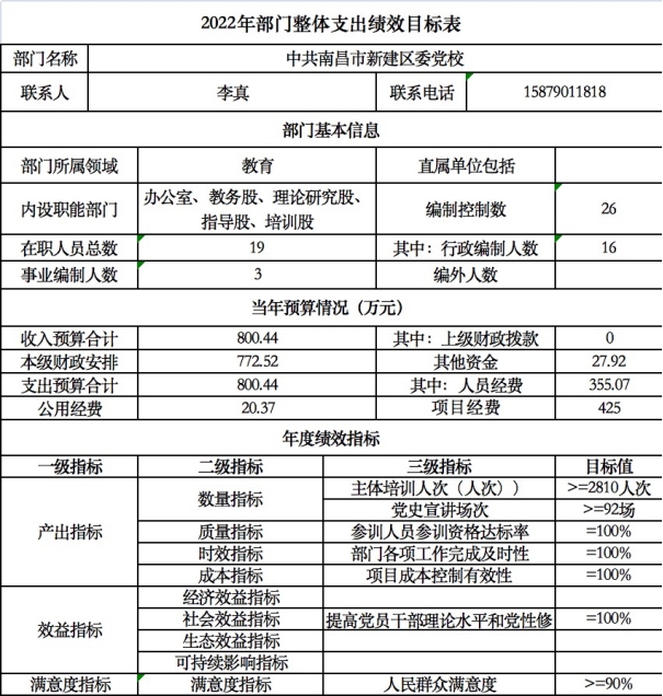 產出指標:①數量指標:村(社區)“兩委”培訓班、青年科級干部培訓班、新提拔科級培訓班、股級干部培訓班、區直部門專題培訓班>=27期;承辦各類會議(次)>=250次。②質量指標:學員培訓有效性100%;會議召開及時率100%;③時效指標:資金及時到位率100%;④成本指標:項目成本控制有效性100%;
