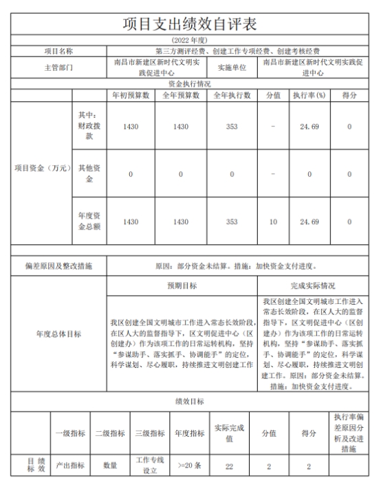 組織對“第三方測評經費、創建工作專項經費、創建考核經費”1個項目開展了部門評價,涉及一般公共預算支出 353萬元,政府性基金預算支出 0 萬元,國有資本預算支出 0 萬元。從評價情況來看,根據三定方案、2022年工作計劃及工作總結及單位財務和決算數據的基礎上,結合單位2022年度績效目標表開展了本次部門整體績效自評工作。具體工作開展過程如下: