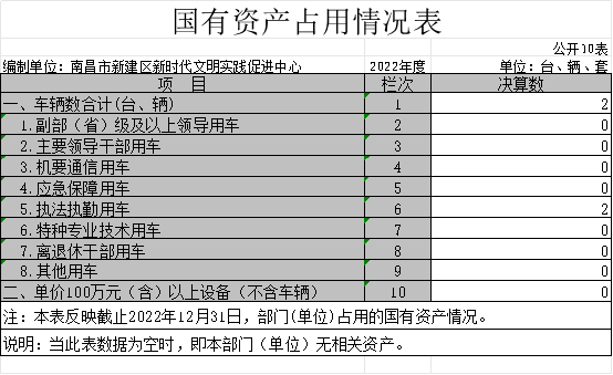 截止2022年12月31日,本部門(單位)國有資產占用情況見公開10表《國有資產占用情況表》。其中車輛中的其他用車主要是部門共有車輛2輛,其中,一般公務用車 0 輛,執法執勤用車2輛。