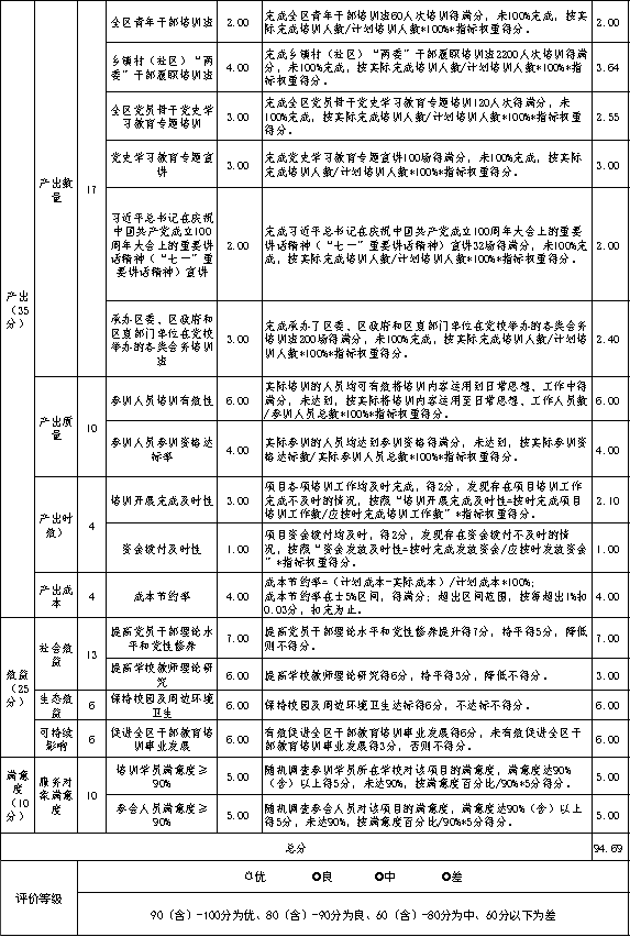 為了解干部教育培訓經費及會務經項目實施質量情況設立此項指標;通過核查項目業務資料,鄉鎮村(社區)“兩委”干部履職培訓班、全區青年干部培訓班、全區黨員骨干黨史學習教育專題培訓等培訓工作均嚴格按照培訓通知要求,核定培訓對象資格,參訓人員參訓資格達標率為100.00%。根據評分標準,該指標得5.00分。