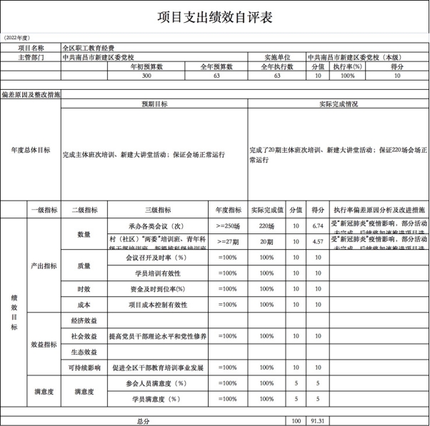 組織對“干部教育培訓經費及會務經費”、“黨校科研業務經費”等3個項目開展了部門評價,涉及一般公共預算支出138萬元,政府性基金預算支出0萬元,國有資本預算支出0萬元。從評價情況來看,本次評價項目績效評級為“優”的有3個,綜合自評得分為97.1分,整體為“優”。各項目基本完成預期目標,但總體在預算執行方面仍有待加強,且個別項目產出數量和進度未達預期,如村(社區)“兩委”培訓班、青年科級干部培訓班、新提拔科級培訓班、股級干部培訓班、區直部門專題培訓班27期,實際只開展20次;承辦各類會議(次)250次,實際只承辦了220場。