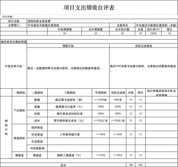 依據《項目支出績效評價管理辦法》“項目預算資金是否按照計劃執行”設立此指標。通過核查項目財務材料,截至2022年12月31日,干部教育培訓經費及會務經項目申請到位資金63萬元,實際支出資金共計63萬元,預算資金執行率100.00%。根據評分標準,該指標得分5.00分。黨校科研業務經費項目申請到位資金55萬元,實際支出資金共計55萬元,預算資金執行率100.00%。根據評分標準,該指標得分5.00分。