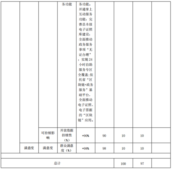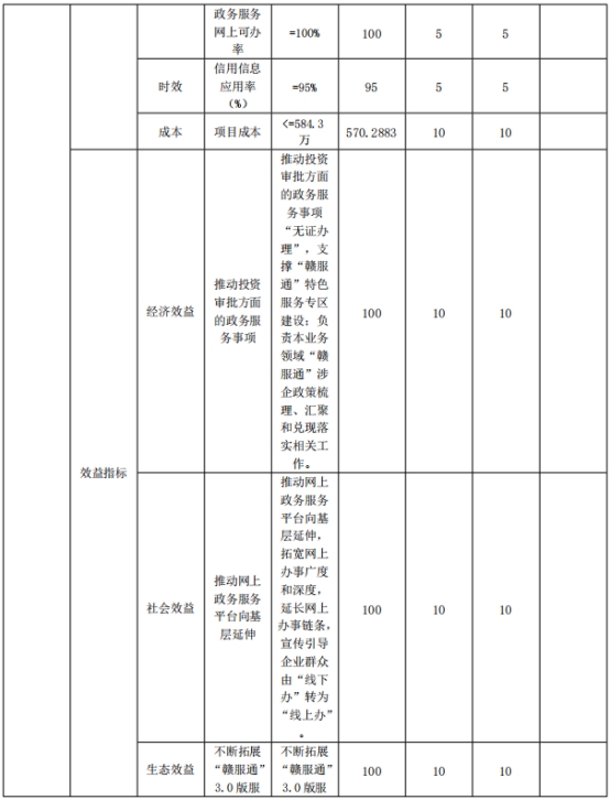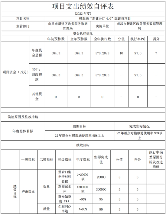 贛服通“新建分廳4.0”版建設項目績效自評綜述:為不斷完善提升“贛服通”服務功能,持續推進平臺迭代升級,新建區政務服務數據管理局安排584.3萬元,用于贛服通“新建分廳4.0”版建設項目,主要用于建設“贛服通”4.0版新建區分廳和分廳后臺綜合管理系統,建成以“贛服通”4.0版新建區分廳為主,各相關部門二級欄目為輔的綜合門戶app,完成三級等保測評并完成第三方軟件測試等工作。根據年初設定的績效目標,贛服通“新建分廳4.0”版建設項目績效自評得分為98分。項目全年預算數為584.3萬元,執行數為584.3萬元,完成預算的100%。項目績效目標完成情況:一是在預定時間內完成“新建分廳4.0”版建設并宣傳推廣運用,保障線上APP正常運行;二是全面打通國家、省、市和區直相關部門自建系統,打通數據堵點,擴大網辦渠道,政務服務網上可辦率達100%,全程網辦率達90%以上。三是提高了網上辦件效率,提高企業開辦,辦證等效率,降低群眾辦事成本,提高了政務服務水平,營造了良好的營商環境。該項目服務對象是企業和群眾,目前企業滿意度92%,群眾滿意度 96%,滿意度較高。