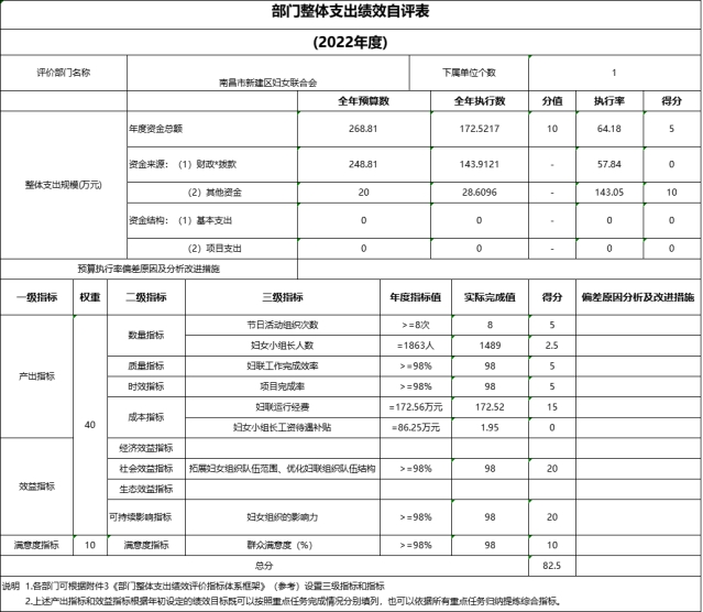 根據新建區財政局《南昌市新建區財政局關于開展2021年度單位自評及部門評價工作的通知》(新財字〔2022〕27號)文件精神,全面提高財政資源配置效率和使用效益,加快建立全方位、全過程、全覆蓋、全公開的預算績效管理機制,單位成立了由主要領導和各相關科室負責人組成的績效評價工作小組,評價工作組在對資金使用單位自評材料分析審核的基礎上,結合現場評價的情況,核實自評情況及佐證材料的真實性,檢驗績效目標完成情況,發現典型問題,剖析原因,對財政資金使用績效作出客觀、科學的評價,認真完成了項目績效評價報告的撰寫,報告力求客觀、公正、全面地反映單位2022年度財政項目支出的實際績效。