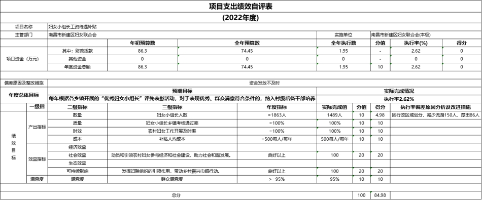根據預算績效管理要求,區婦聯組織對納入2022年度部門預算范圍的二級項目1個全面開展績效自評,涉及一般公共預算支出74.45萬元,政府性基金預算支出0萬元,國有資本預算支出0萬元,占項目支出總額的 51.54 %。2022年區財政年初預算安排了婦女小組長工資待遇補貼項目資金 86.25 萬元用于支付全區婦女小組長1725人每人每年500元工資待遇補貼,因行政區域劃分,減少了流湖150人,厚田86人,實發1489人的工資待遇補貼項目資金 74.45萬元。因財政資金未及時撥付,實際到位資金為1.95萬元, 資金到位率為 2.62%,項目資金全部用于支付全區在職在崗婦女小組長工資待遇補貼。從評價情況來看區婦聯資金的撥付有完整的審批過程和手續且不存在擠占挪留的情況。