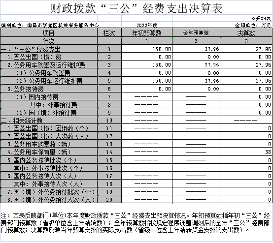 (三)公務用車購置及運行維護費支出27.96萬元,其中公務用車購置年初預算數為0萬元,決算數為0萬元,完成預算的0 %,本部門為新增部門,上年度數據在南昌市新建區人民政府辦公室,全年購置公務用車0輛。決算數較年初預算數無變化;公務用車運行維護費支出年初預算數為150 萬元,決算數為27.96萬元,完成預算的18.64 %,本部門為新增部門,上年度數據在南昌市新建區人民政府辦公室,年末公務用車保有38輛。