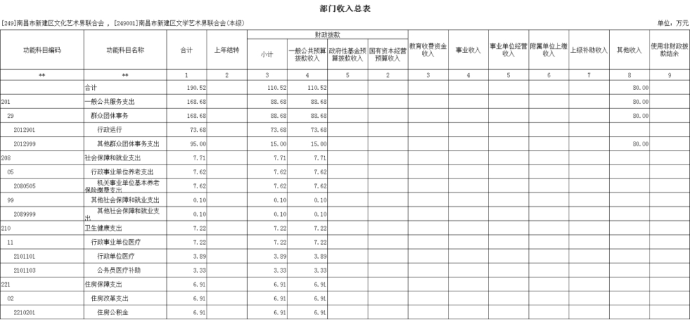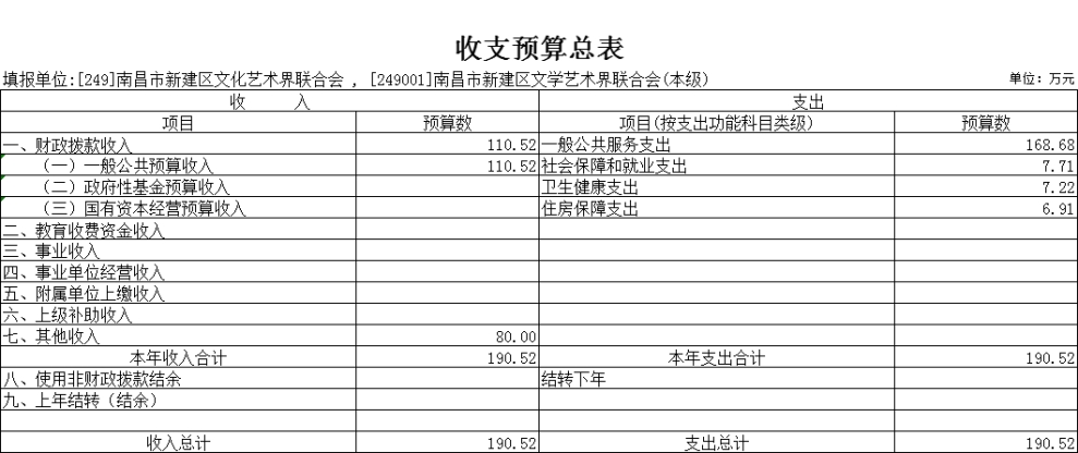 2025年南昌市新建區文學藝術界聯合會單位收入預算總額為 190.52萬元,較上年預算安排增加15.17萬元,上升8.65%,主要原因是:人員數量較上年相比增加1人。其中:財政撥款收入 110.52萬元,較上年預算安排增加15.17萬元,主要原因是:人員較上年相比增加1人;教育收費資金收入 0 萬元,較上年預算安排增加 0 萬元;事業收入0 萬元,較上年預算安排增加 0 萬元;事業單位經營 收入 0 萬元,較上年預算安排增加 0 萬元; 附屬單位上繳收入 0 萬元,較上年預算安排增加 0 萬元;上級補助收入 0 萬元,較上年預算安排增加 0萬元;其他收入 80 萬元,較上年預算安排增加 0 萬元,主要原因是:與上年保持一致;使用非財政撥款結余 0 萬元,較上年預算安排增加 0 萬元;上年結轉(結余) 0 萬元,較上年預算安排增加 0 萬元。