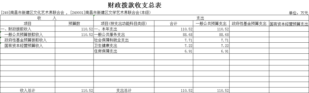 2025年南昌市新建區文學藝術界聯合會部門財政撥款支出預算總額110.52 萬元,較上年預算安排增加15.17萬元,主要原因是:人員較上年相比增加1人;