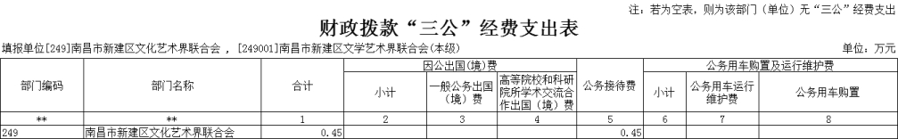 2025年南昌市新建區文學藝術界聯合會單位"三公"經費財政撥款安排 0.45 萬元,其中:。
