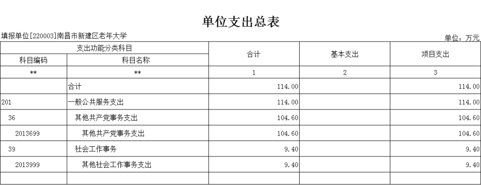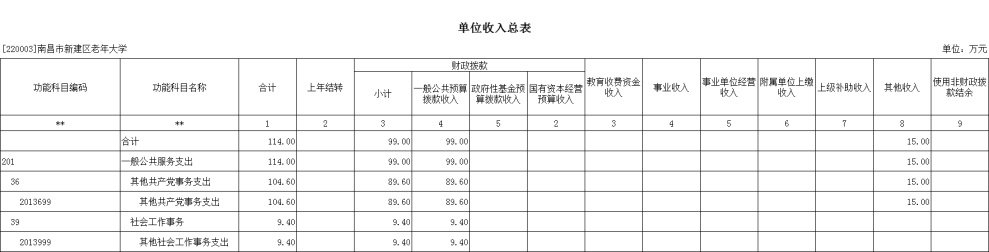 2025年南昌市新建區(qū)老年大學單位支出預算總額為 114 萬元,較上年預算安排增加0萬元,增長0 %,主要原因是:與上年預算持平; 其中: