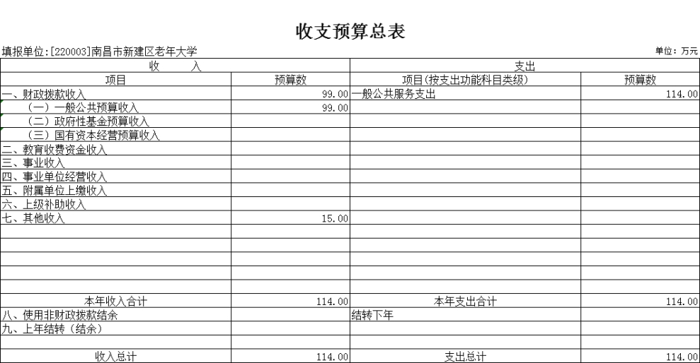 2025年南昌市新建區(qū)老年大學單位收入預算總額為 114萬元,較上年預算安排增加0萬元,下降 0%,主要原因是:與上年預算持平。其中財政撥款收入 99 萬元,較上年預算安排增加0萬元,主要原因是:與上年預算持平;教育收費資金收入 0 萬元,較上年預算安排增加 0 萬元;事業(yè)收入 0 萬元,較上年預算安排增加 0 萬元;事業(yè)單位經(jīng)營收入 0 萬元,較上年預算安排增加 0 萬元;附屬單位上繳收入 0 萬元,較上年預算安排增加 0 萬元;上級補助收入 0 萬元,較上年預算安排增加 0 萬元;其他收入 15 萬元,較上年預算安排增加 0 萬元,主要原因是:與上年預算持平;使用非財政撥款結(jié)余 0 萬元,較上年預算安排增加 0 萬元;上年結(jié)轉(zhuǎn)(結(jié)余)0 萬元,較上年預算安排增加 0 萬元。