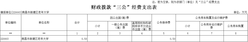 2025年南昌市新建區(qū)老年大學單位為"三公"經(jīng)費財政撥款安排 0.5 萬元,其中: