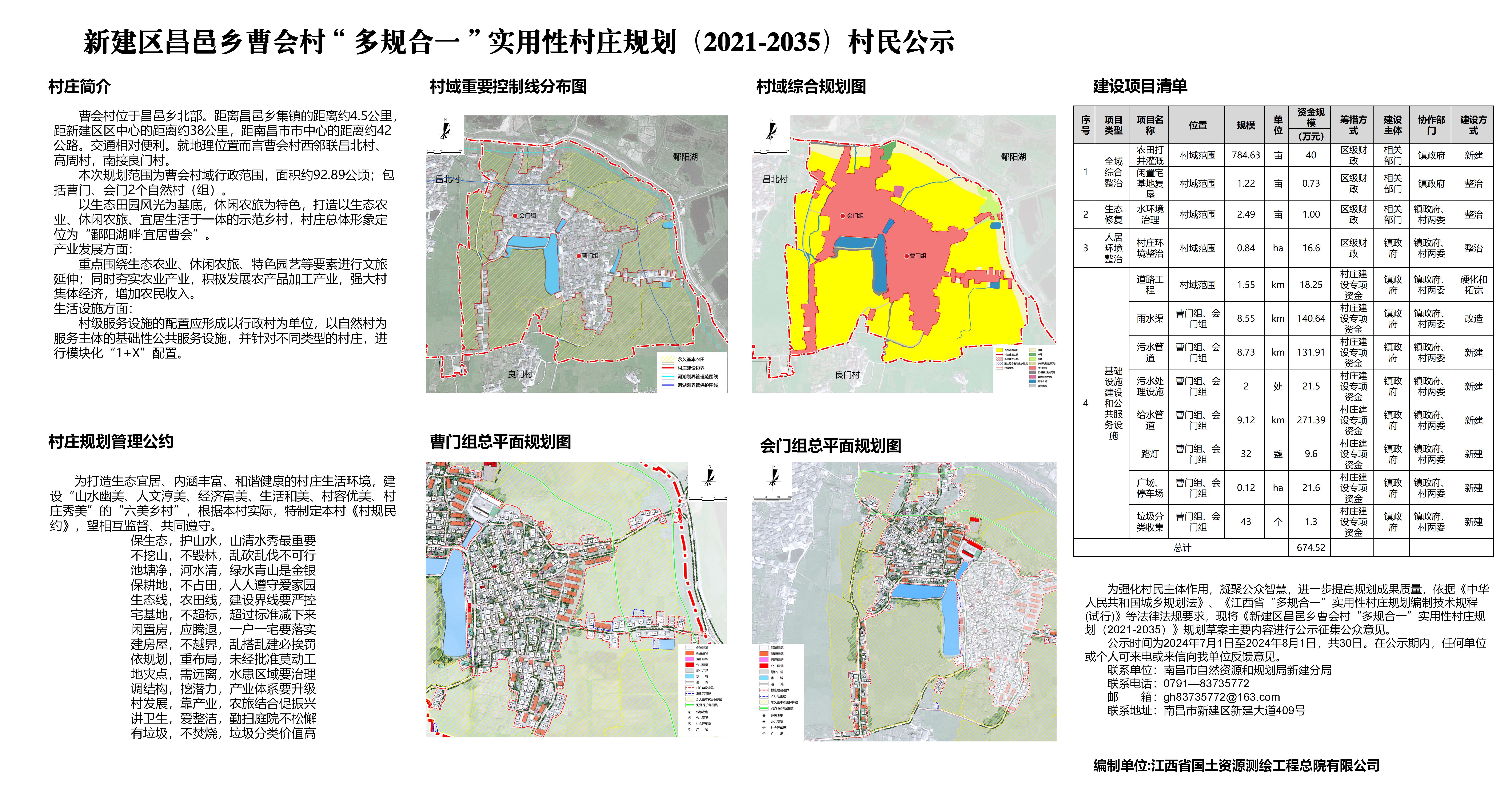為強化村民主體作用,凝聚公眾智慧,進一步提高規劃成果質量,依據《中華人民共和國城鄉規劃法》、《江西省“多規合一”實用性村莊規劃編制技術規程(試行)》等法律法規要求,現將《新建區昌邑鄉曹會村“多規合一”實用性村莊規劃(2021-2035)》規劃方案主要內容進行公示征集公眾意見。