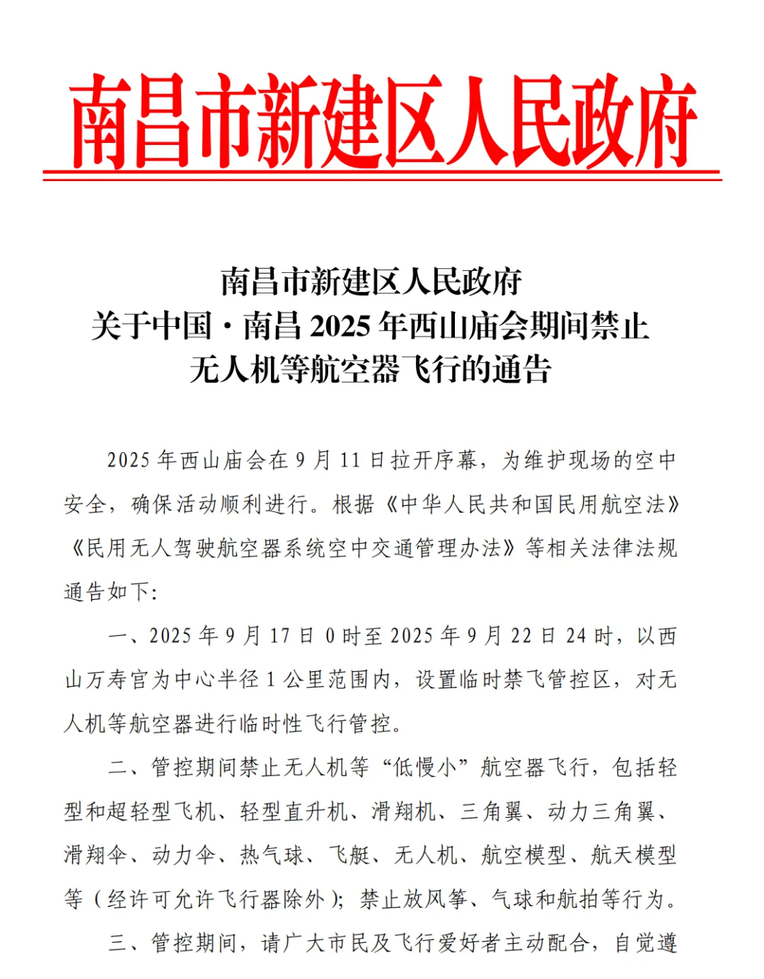 一、2025年9月17日0時至2025年9月22日24時,以西山萬壽宮為中心半徑1公里范圍內,設置臨時禁飛管控區,對無人機等航空器進行臨時性飛行管控。