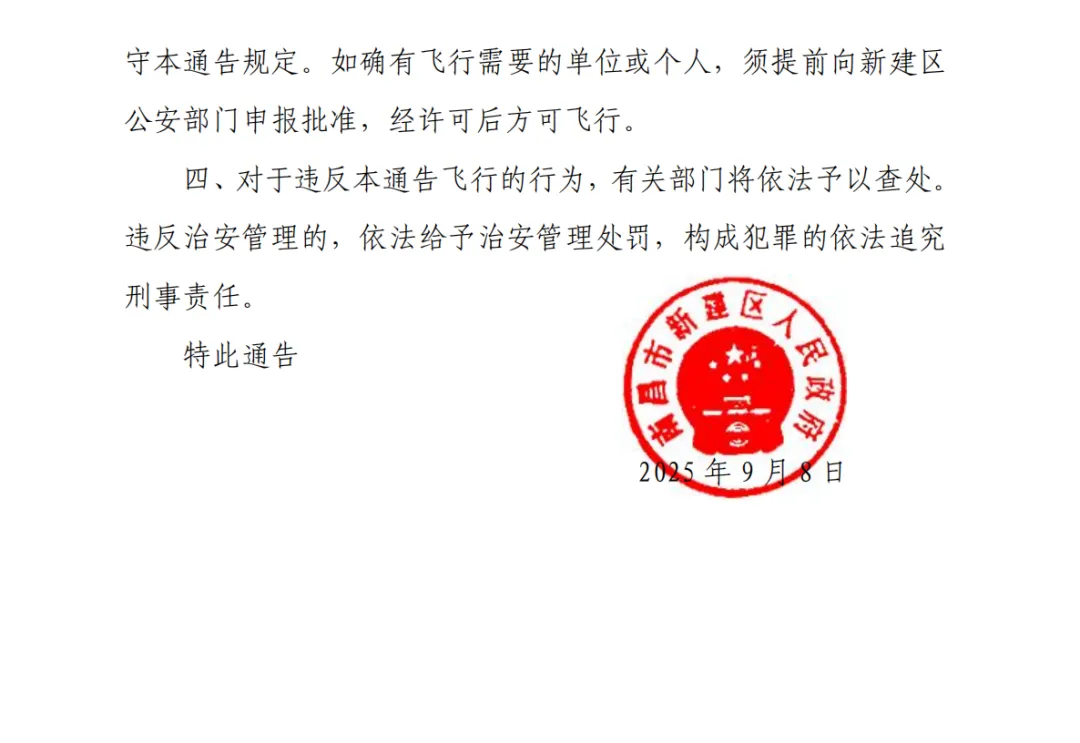 三、管控期間,請廣大市民及飛行愛好者主動配合,自覺遵守本通告規定。如確有飛行需要的單位或個人,須提前向新建區公安部門申報批準,經許可后方可飛行。