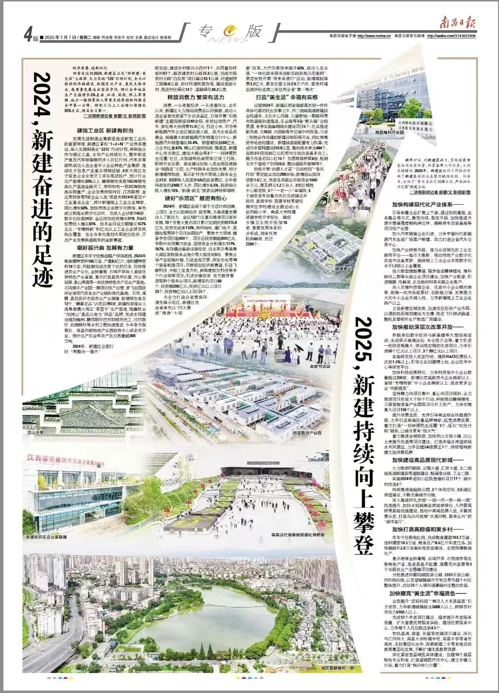 1月7日,南昌日報4版整版分別以《2024,新建奮進的足跡》《2025,新建持續向上攀登》為題,對新建區2024年經濟社會發展成就進行了回顧,以及對2025年經濟社會發展目標進行了展望。