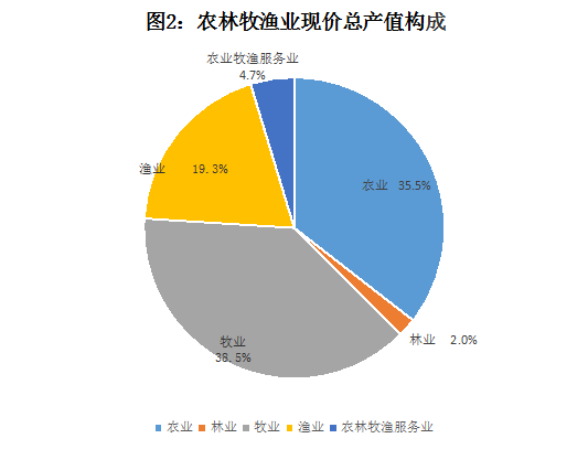 農業生產: 全年完成農林牧漁業現價總產值119.26億元,按可比價計算,增長2.9%。其中,農業產值42.35億元,增長3.7%;林業產值2.36億元,增長7.4%;牧業產值45.96億元,增長0.8%;漁業產值23.04億元,增長2.8%;農林牧漁服務業產值5.55億元,增長10.3%。