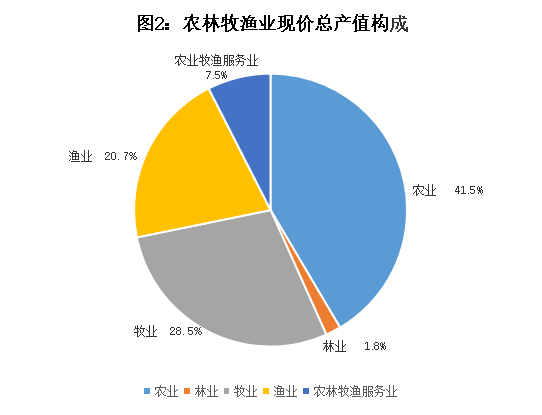 農(nóng)業(yè)生產(chǎn): 全年完成農(nóng)林牧漁業(yè)現(xiàn)價總產(chǎn)值96.96億元,按可比價計算,增長9.8%。其中,農(nóng)業(yè)產(chǎn)值40.24億元,增長4.5%;林業(yè)產(chǎn)值1.77億元,增長2.6%;牧業(yè)產(chǎn)值27.66億元,增長16.6%;漁業(yè)產(chǎn)值20.09億元,增長7.3%;農(nóng)林牧漁服務(wù)業(yè)產(chǎn)值7.21億元,增長14.2%。