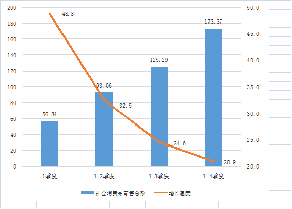 2021年,全區(qū)實現(xiàn)社會消費品零售總額173.37億元,增長20.9%。分銷售地域看,城鎮(zhèn)實現(xiàn)零售額141.56億元,增長22.1%;鄉(xiāng)村實現(xiàn)零售額31.81億元,增長15.6%。