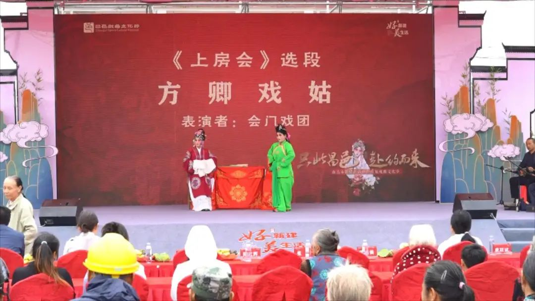10月1日,昌邑鄉(xiāng)伍喻村三風(fēng)廣場(chǎng)上人頭攢動(dòng),熱鬧非凡,全鄉(xiāng)6個(gè)劇團(tuán)正在同臺(tái)獻(xiàn)藝,將大家耳熟能詳?shù)拿页握宫F(xiàn)在大家眼前。這些劇團(tuán)演員都是土生土長(zhǎng)的本地農(nóng)戶(hù),趁著秋收前的農(nóng)閑時(shí)間,脫下草帽,穿上戲袍,將采茶戲演繹得惟妙惟肖,讓人們感受到濃郁的地方文化氣息。